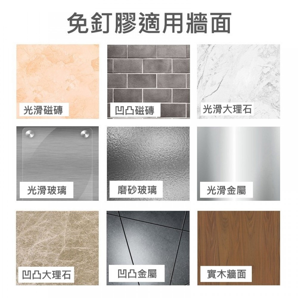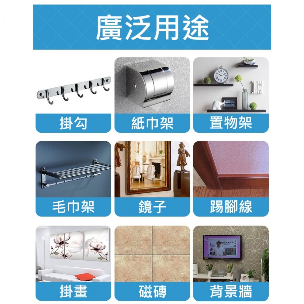 A:掛鉤、毛巾架、浴巾架、紙巾盒、馬桶刷、置物架、刀架、地板壓條、門把手、踢腳線、門鎖、 畫框、木地板、照片牆、背景牆、門框、桌椅、藝術玻璃、廣告字、石膏板、纖維板、石材、水泥、 大理石、瓷磚、PVC塑料、橡膠等...使用範圍廣泛,有客人拿來粘了鞋子,也是OK的喔。Q:這個膠可防水嗎❓