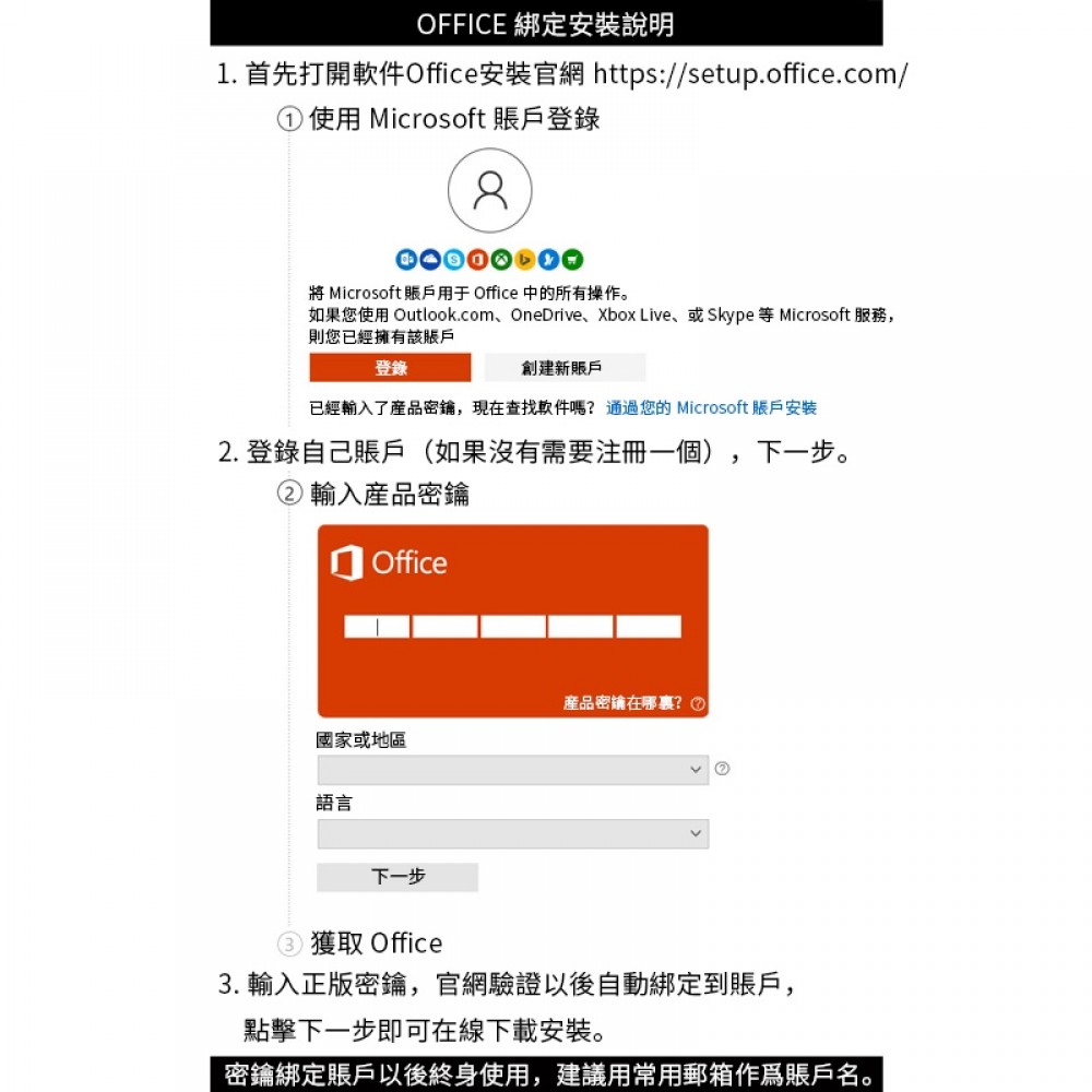 請到office微軟官網,登入帳號(若無微軟帳號請註冊)。並依照指示,輸入金鑰序號。下載office主程式安裝